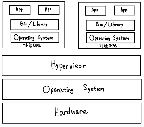 - 운영체제 위에 Hypervisor(하이파이저)라는 기술을 이용하여 VM(가상머신)을 기동하는 방식