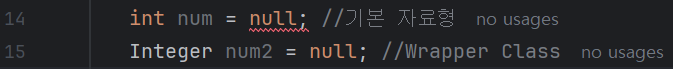 - 값을 직접 저장하기 때문에 null을 허용하지 않습니다. 만약 기본형에 null을 넣고싶다면, Wrapper Class를 활용해야합니다.