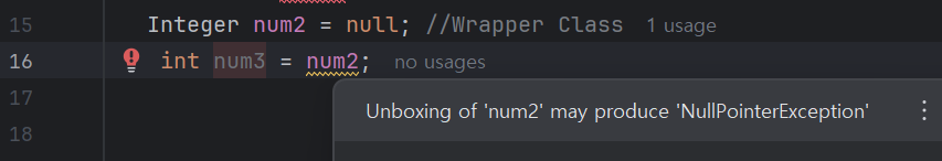 null값을 가진 래퍼 클래스를 기본 자료형으로 언박싱하려고 하면 NPE가 발생합니다.