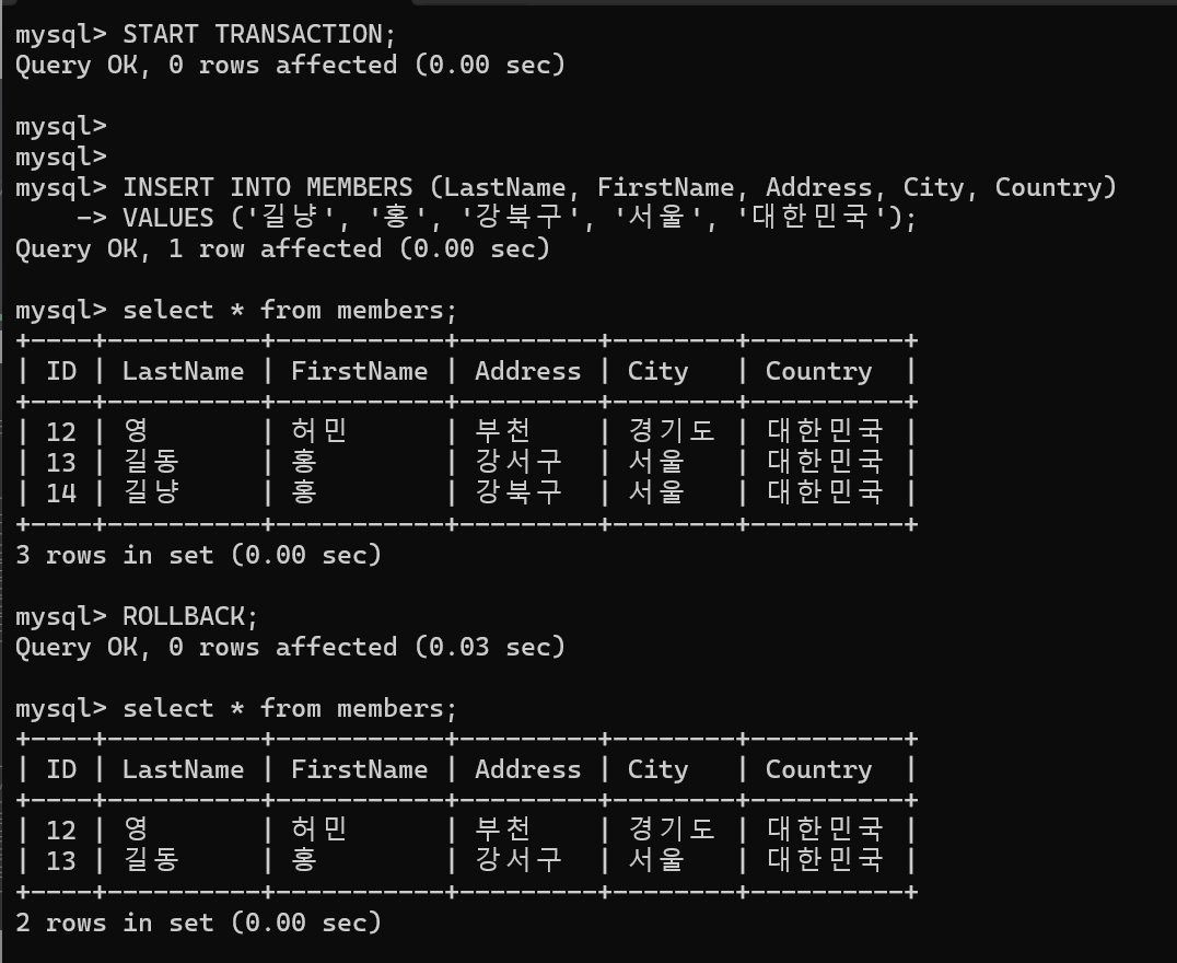 테이블에 데이터가 넣어졌음에도 rollback한 순간 예전 상태로 되돌아가는 것을 볼 수 있습니다.