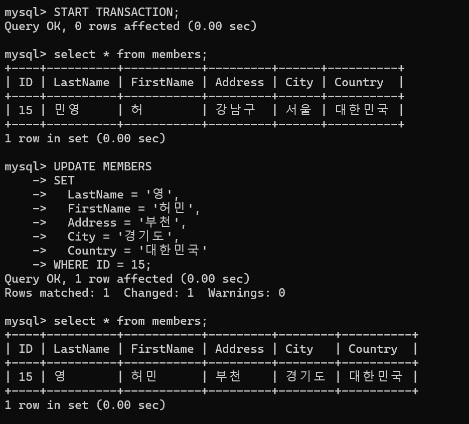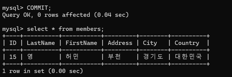 명령어들은 MySQL에서 자동 Commit을 통해 쿼리 입력과 동시에 처리하여 데이터베이스에 반영됩니다.